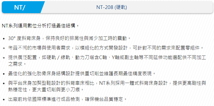產(chǎn)品型號:NT-208 (硬軌)斜床身數(shù)控車床|NT-208 (硬軌)斜床身數(shù)控車床|NT-208 (硬軌)斜床身數(shù)控車床|NT-208 (硬軌)斜床身數(shù)控車床|NT-208 (硬軌)斜床身數(shù)控車床|