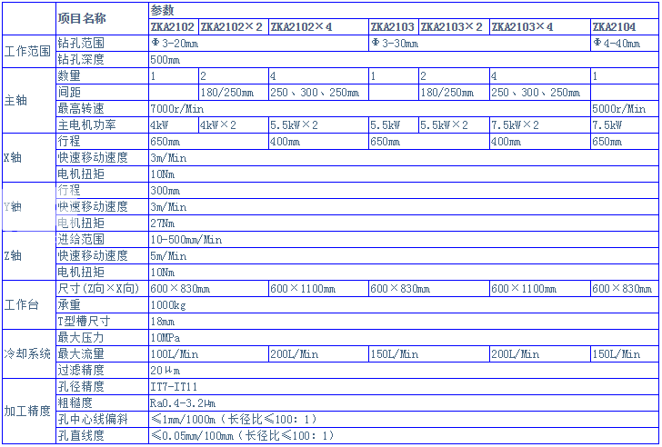 ZKA21系三坐標(biāo)數(shù)控深孔鉆機(jī)床采用槍鉆加工方式(外排屑),刀具旋轉(zhuǎn)進(jìn)給,工件固定在工作臺(tái)上,工作臺(tái)可以垂直和橫向移動(dòng);采用進(jìn)口或國產(chǎn)的數(shù)控系統(tǒng),具有單動(dòng)和自動(dòng)循環(huán)功能,三個(gè)伺服軸:X軸、Y軸、Z軸,采用伺服電機(jī)驅(qū)動(dòng)滾珠絲杠副實(shí)現(xiàn)各軸的移動(dòng);刀具轉(zhuǎn)速和進(jìn)給量均為無級(jí)調(diào)速。******鉆孔直徑是20mm、30mm、40mm三種規(guī)格。具有鉆削直孔、斜孔、盲孔和階梯孔的功能。廣泛應(yīng)用于汽車、摩托車行業(yè)、模具行業(yè)、軍工行業(yè)、航天工業(yè)、液壓閥體、齒輪軸類等零件的小深孔加工。