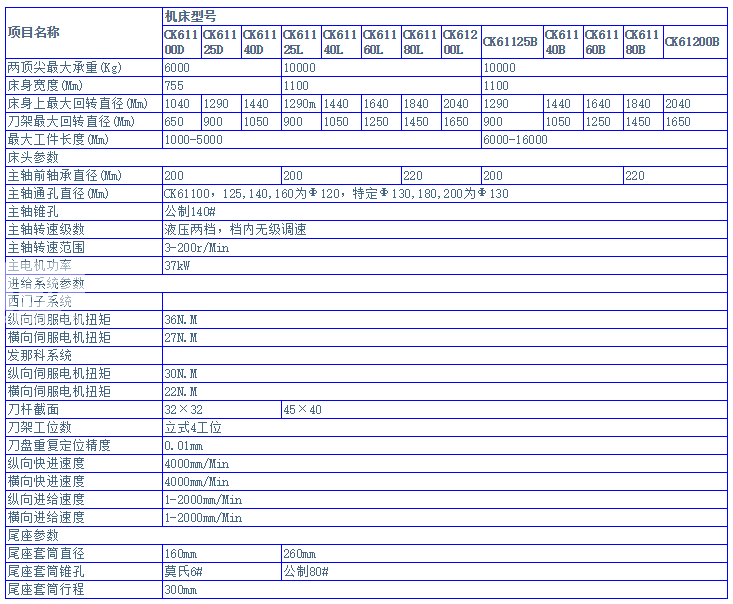 CK611系列機(jī)床為大型臥式平床身數(shù)控車床,采用SIEMENS或FANUC數(shù)控系統(tǒng),及全數(shù)字交流伺服系統(tǒng)。車削主傳動(dòng)D,L,B,H型為自動(dòng)兩擋無級(jí)變速,主電機(jī)為交流主軸電機(jī),E,N型為手動(dòng)四擋無級(jí)變速,主電機(jī)為交流電機(jī),兩個(gè)聯(lián)動(dòng)控制軸。中心距1-5M的機(jī)床Z軸和X軸采用滾珠絲杠副加交流伺服電機(jī)實(shí)現(xiàn)縱向和橫向移動(dòng);中心距6M以上的機(jī)床Z軸采用齒輪齒條加光柵尺,X軸采用滾珠絲杠副加交流伺服電機(jī)實(shí)現(xiàn)縱向和橫向移動(dòng),具有很好的定位和重復(fù)定位精度。